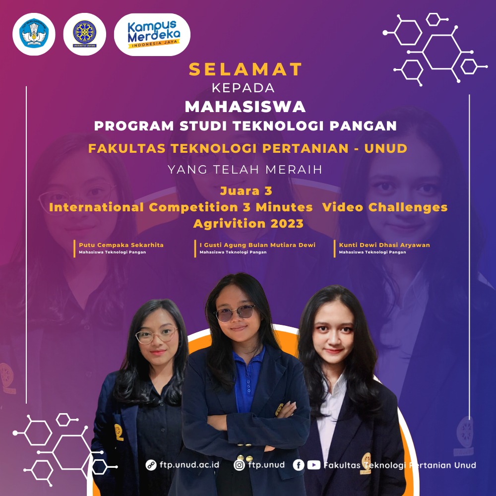 Bulan yang sebelumnya telah meraih beberapa juara pada ajang lomba seperti Juara I Lomba Tiktok Keamanan Pangan dan Juara 2 Lomba Essay Nasional, kali ini bersama tim yang terdiri dari Putu Cempaka Sekarhita dan Kunti Dewi Dhasi Aryawan (KUCABUNA Team) di bawah bimbingan Dosen Program Studi Teknologi Pangan I Gede Arie Mahendra Putra, S.TP., M.TP. berhasil meraih juara 3 pada lomba Internasional Agritech Video Competition (Agrivition) 2023 dengan mengusung ide yaitu BROCIOMICS: Diversified Food for Diabetics to Support Food Security.