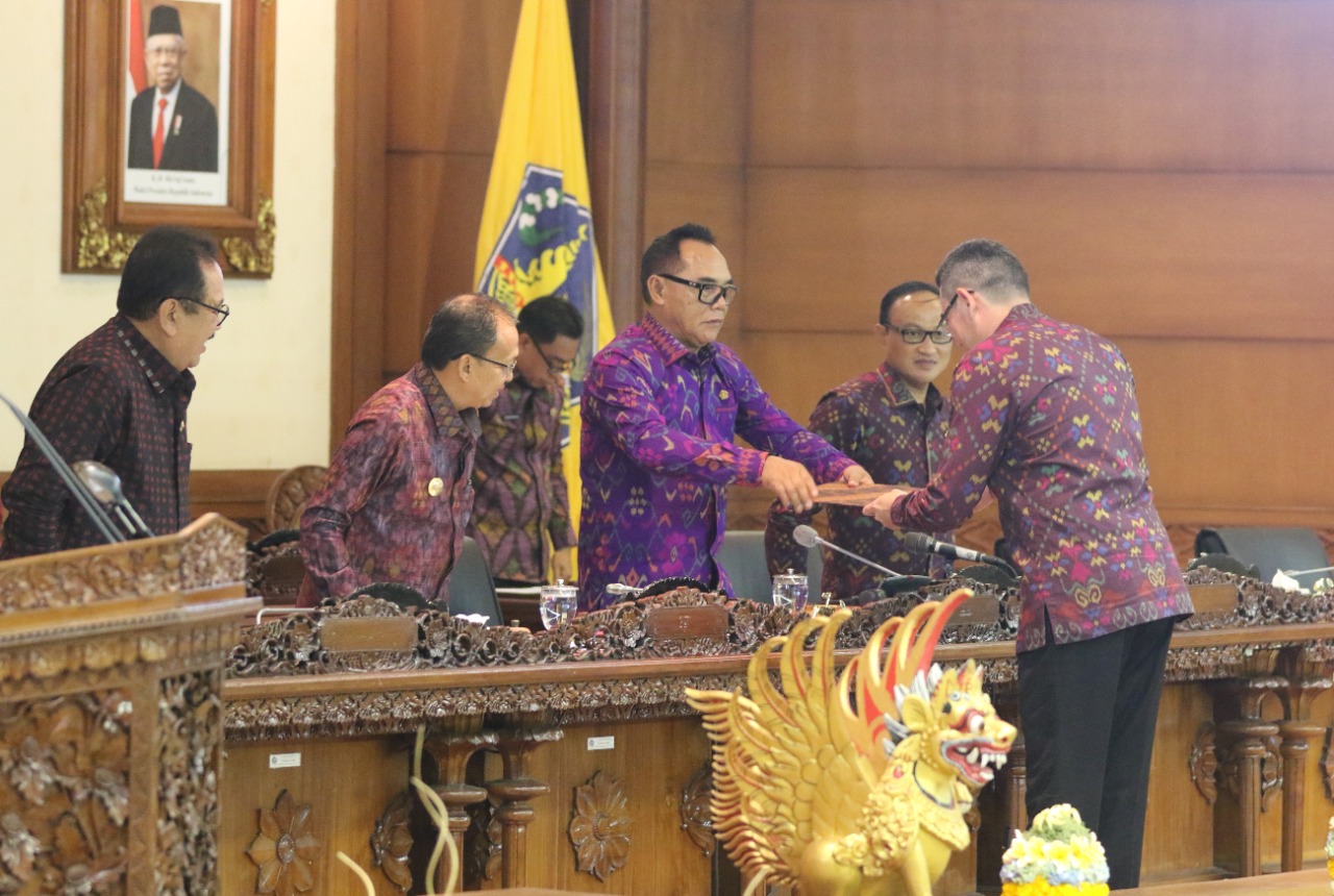 A.A. Ngurah Adhi Ardhana, S.T. serahkan dokumen kepada Ketua Dewan Adi Wiryatama. (Foto: Ist)