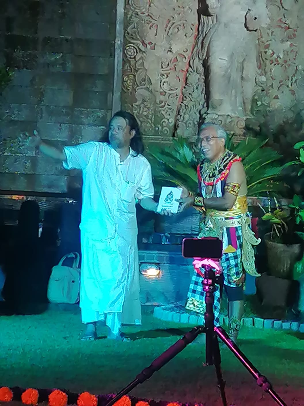 “Saya ingin memaksimalkan efek puisi yang ada di buku. Memang bukan tempat biasa, kita setting panggung memanfaatkan keindahan Puri. Tidak ada panggung khusus, tidak ada kursi, tidak ada meja, membaur saja semuanya menyatu. Di sanalah penyatuan kita, menyatu dengan tempat ini,” terang Sahadewa.