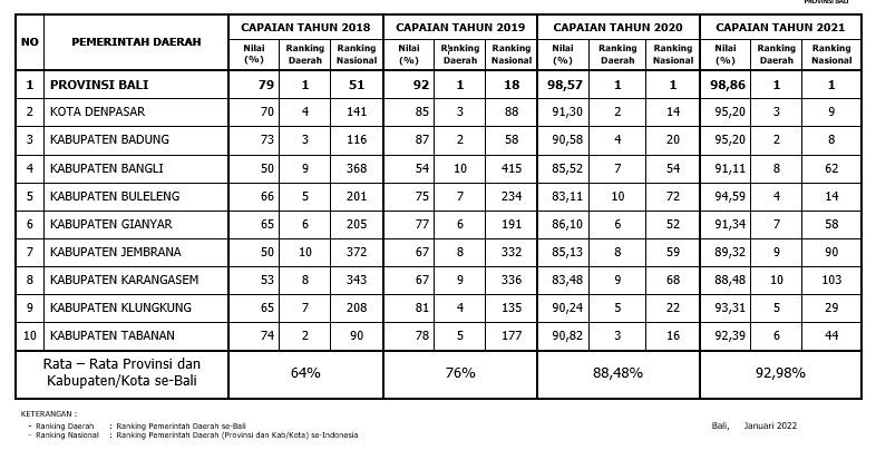 Tahun 2021 (Nilai capaian 98,86%), Peringkat 1 di Provinsi Bali (dari 9 Kabupaten/Kota se-Bali). Peringkat 1 secara Nasional (dari 542 Pemerintah Daerah se-Indonesia).