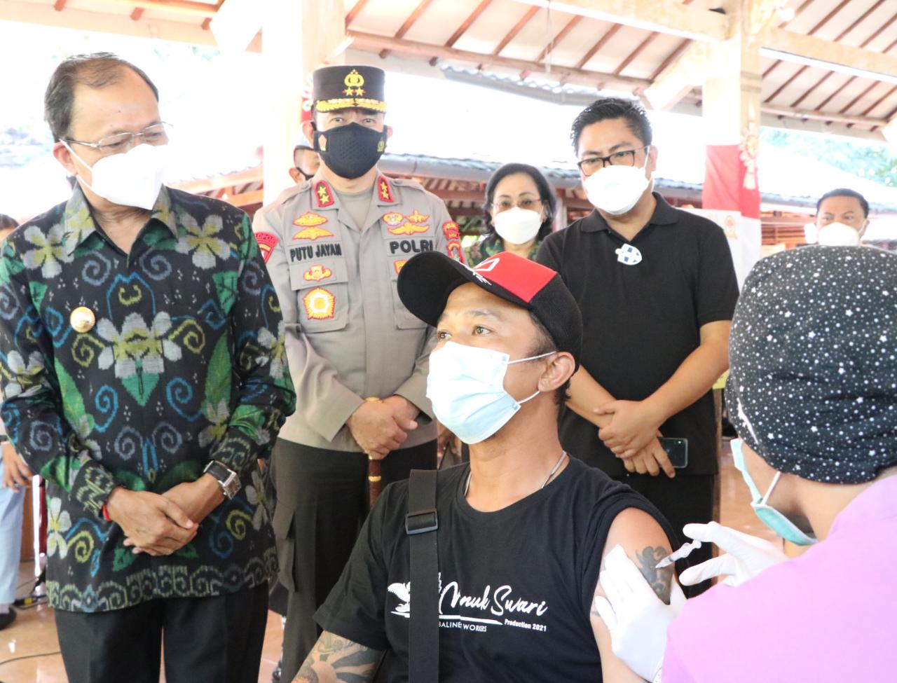 TINJAU VAKSINASI: Gubernur Bali Wayan Koster meninjau kegiatan “Serbuan Vaksinasi” TNI-Polri di parkir timur Lapangan Niti Mandala, Renon dan di Desa Budaya Kertalangu, Kesiman, Denpasar pada Sabtu (Saniscara Pon, Matal) tanggal 26 Juni 2021.