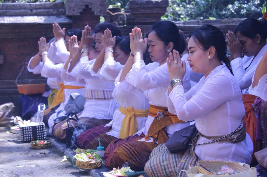 SEMBAHYANG: Ketua TP PKK Kota Denpasar, Ny. Sagung Antari Jaya Negara bersama ratusan lansia saat sembahyang di Pura Luhur Batukaru, Penebel, Tabanan, Selasa (24/10). (Foto: Hms Dps)