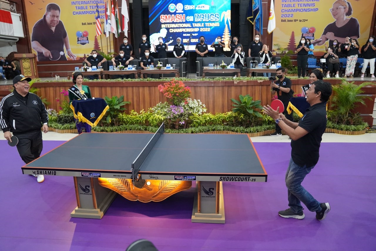 Sebagai tanda peresmian, Bupati didampingi Ketua TP PKK Nyonya Rasniathi Adi Arnawa melakukan servis bola pertama.