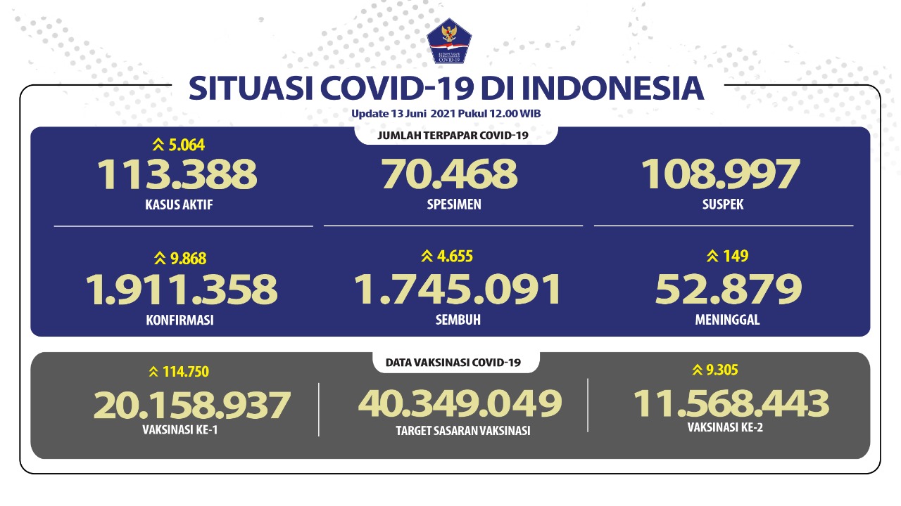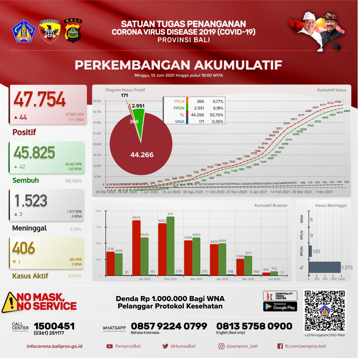 Dengan demikian, jumlah kasus secara kumulatif sebagai berikut. Terkonfirmasi positif sebanyak 47.754 orang, pasien sembuh 45.825 orang (95,96%), dan meninggal dunia 1.523 orang (3,19%). Kasus aktif per hari ini menjadi 406 orang (0,85%).