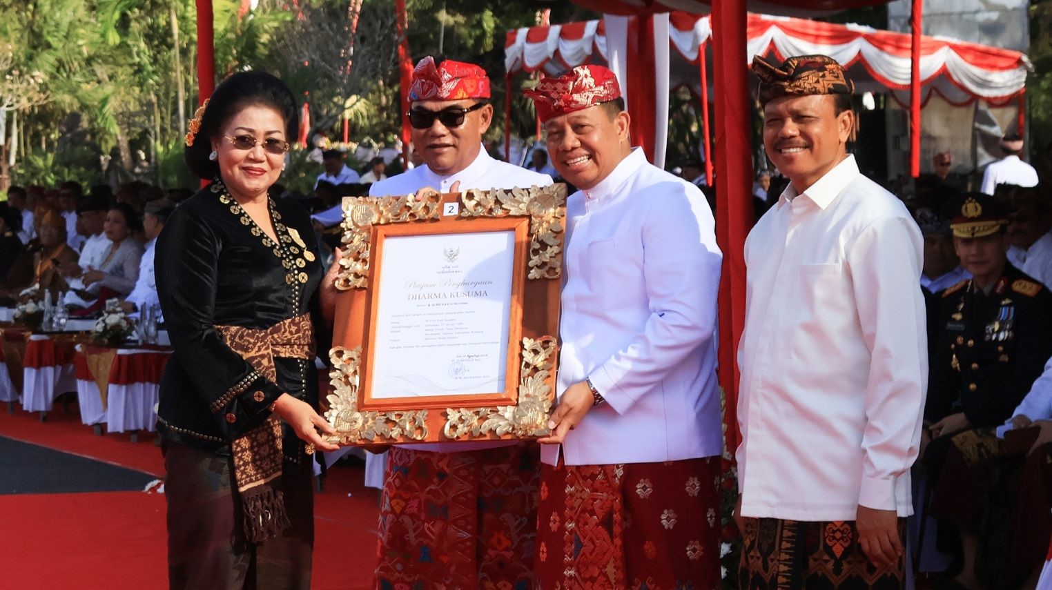 Pada momentum peringatan Hari Jadi Ke-66 Provinsi Bali, Pj. Gubernur Mahendra Jaya bersama Ketua DPRD Bali I Nyoman Adi Wiryatama dan didampingi Sekretaris Daerah Provinsi Bali Dewa Made Indra menyerahkan Penghargaan Dharma Kusuma kepada tokoh berprestasi dan berkontribusi luar biasa dalam pemajuan kebudayaan.