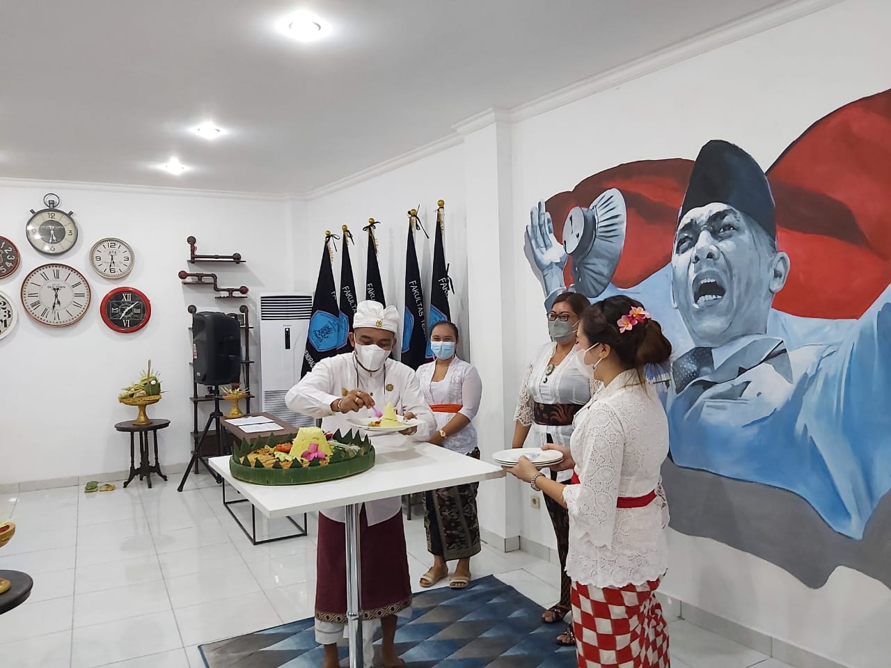 Ketua Umum Yayasan Universitas Mahendradatta melakukan pemotongan tumpeng tanda diresmikannya Gedung Conefo.