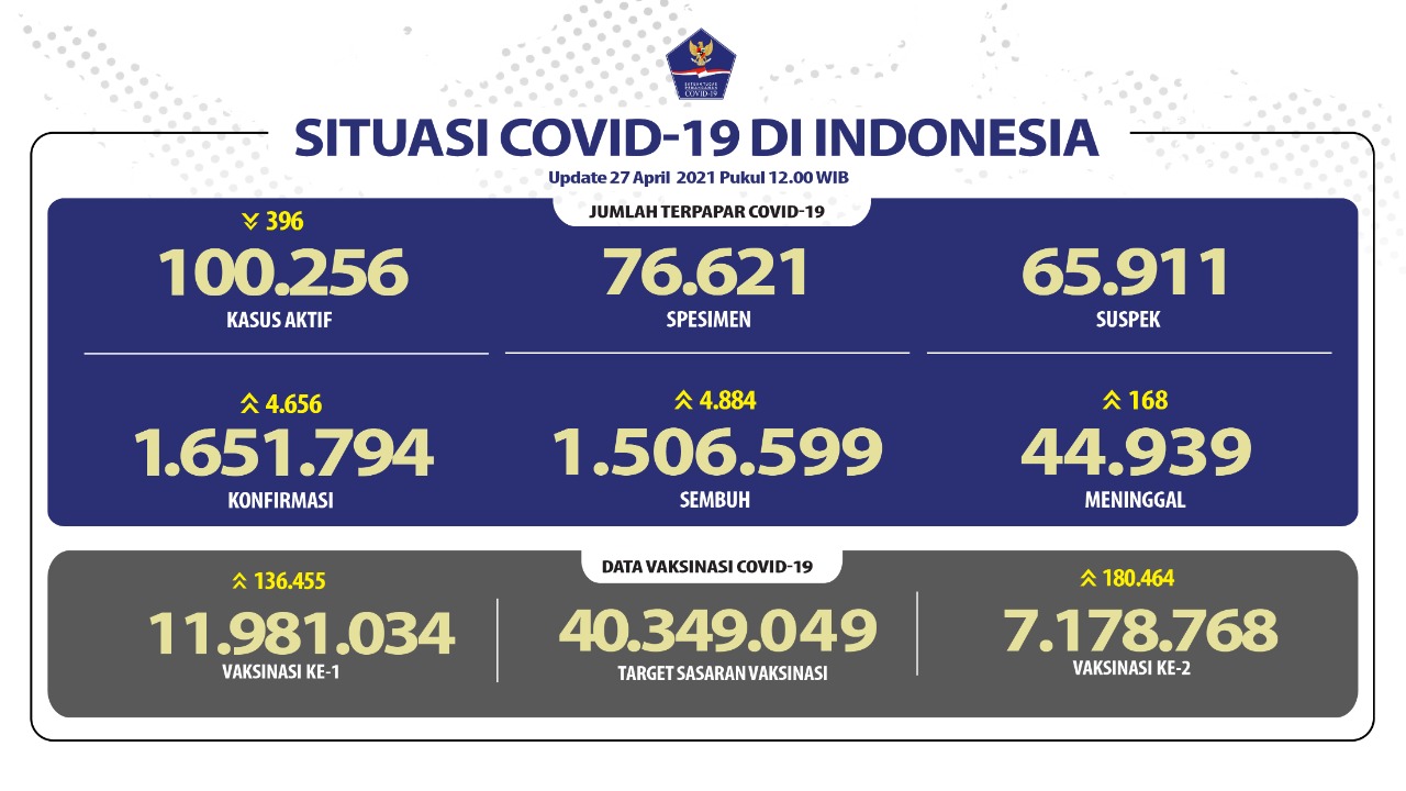 Sementara itu, informasi dari Satgas Nasional melalui Sekretaris Satgas Made Rentin menyebutkan perkembangan Covid secara nasional sebagai berikut. Terkonfirmasi positif sebanyak 4.656 orang, sehingga total positif Covid-19 menjadi 1.651794 orang. Pasien sembuh terjadi pertambahan sebanyak 4.884 orang sehingga total menjadi 1.506.599 orang. Meninggal dunia 168 orang, sehingga menjadi 44.939 orang.
