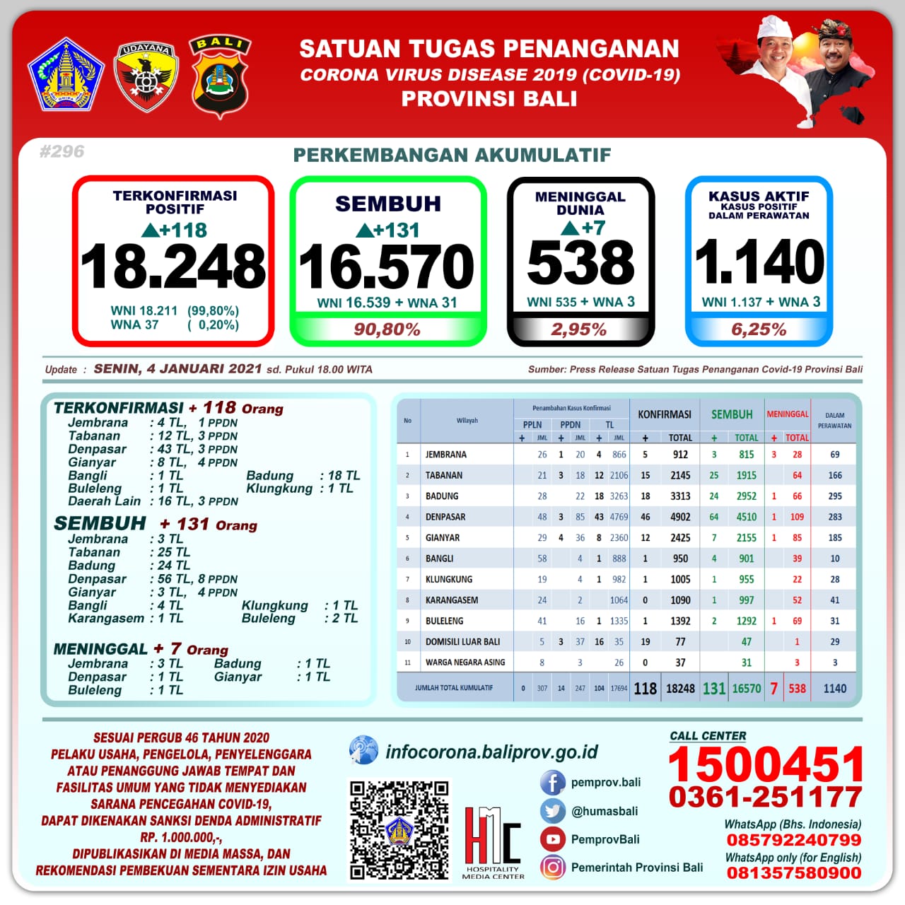 Denpasar, baliilu.com – Perkembangan pandemi Covid-19 di Provinsi Bali per hari ini mencatat pertambahan kasus terkonfirmasi positif sebanyak 118 orang (104 orang melalui transmisi lokal dan 14 PPDN), sembuh sebanyak 131 orang, dan 7 orang meninggal dunia.