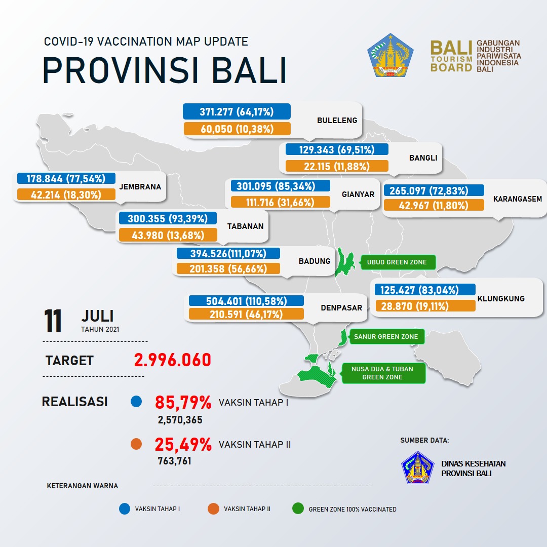 Untuk mempercepat penanganan pandemi, kata Made Rentin, pemerintah telah melakukan upaya vaksinasi kepada masyarakat. Sasaran vaksinasi yang telah terlayani adalah SDM kesehatan, petugas pelayanan publik dan lansia. Masyarakat yang telah memperoleh vaksin 1 sebanyak 2.570.365 orang dan vaksin 2 sebanyak 763.761 orang. Total vaksin yang terdistribusi sebanyak 3.806.860 dosis dengan sisa stok vaksin sebanyak 526.694 dosis.